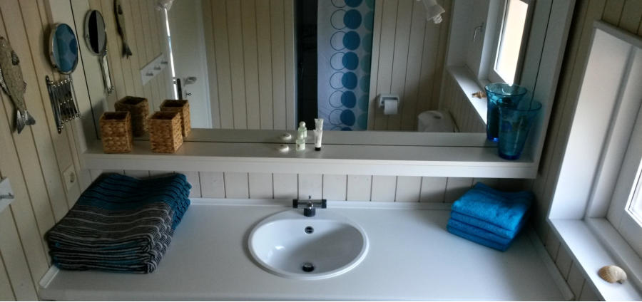 Das Badezimmer Ausstattung                  - Waschtisch mit Schrank - großer Spiegel - Schminkspiegel - WC - Dusche - Waschmaschine - Haartrockner - Kinder-Trittschemel - El. Heizung Kann zu gebucht werden (Bei der Buchung bitte mit angeben) - Handtücher (je Person/Woche) 1 x Duschtuch        1 x Handtuch Starten Sie jetzt Ihre virtuelle Tour durch das Badezimmer